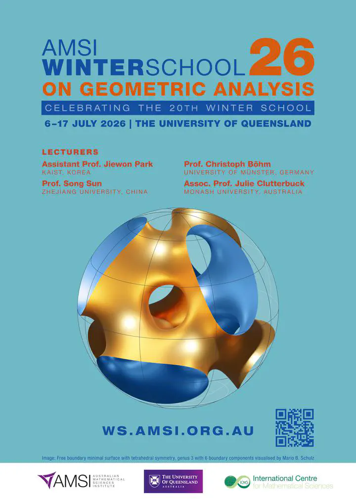 The AMSI Winter School 2026 on Geometric Analysis, which is the 20th Winter School, will take place at The University of Queensland 6-17 July 2026.